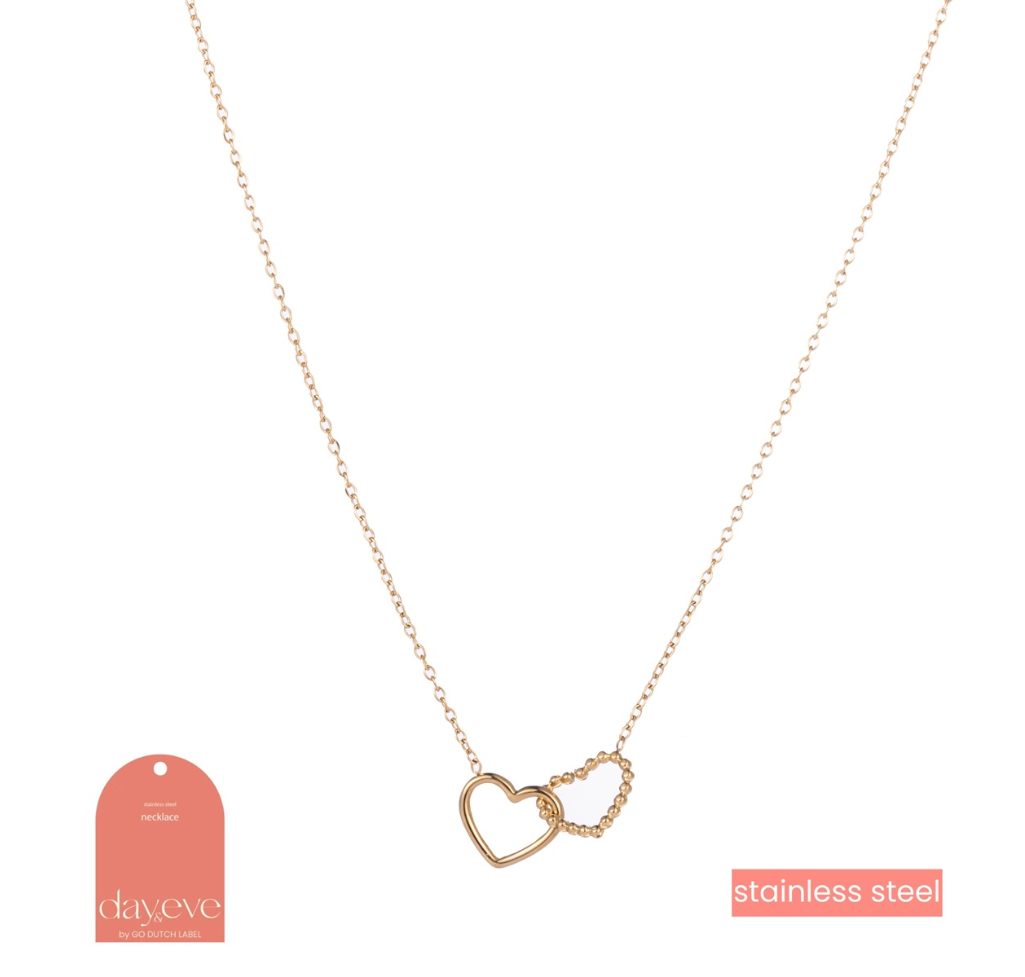 Zarte Kette aus hochwertigem Edelstahl mit 2 ineinander verschlungenen Herzen. Dieses wunderschöne Schmuckstück eignet sich auch hervorragend als persönliches Geschenk für einen lieben Menschen. Edelstahl erweist sich als langlebiges und alltagstaugliches Material. Die goldene Version ist zusätzlich 14k vergoldet.